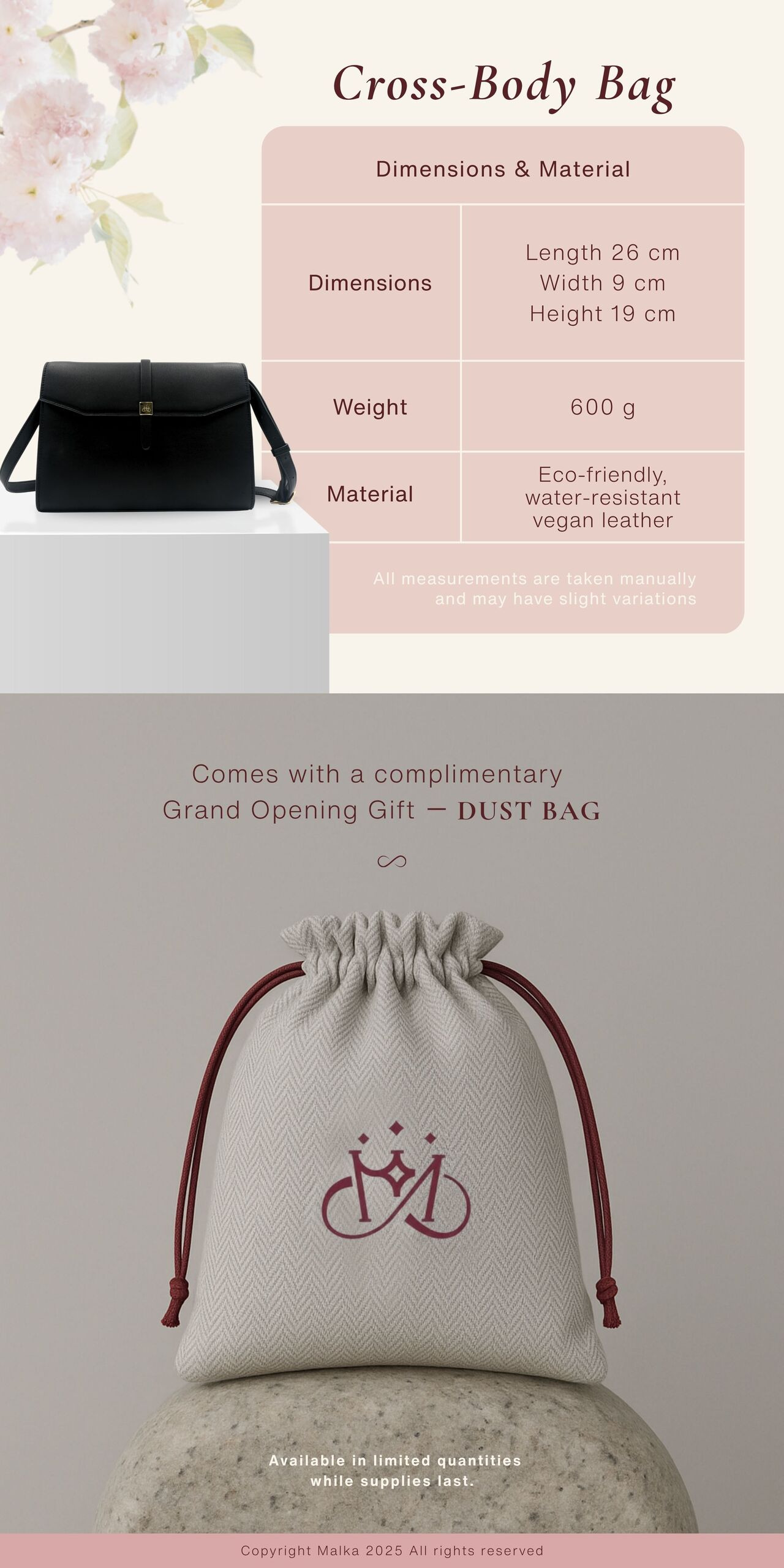 ✨ Specifications ✓ Material: Eco-friendly waterproof vegan leather ✓ Color: Black ✓ Capacity: Fits phone, wallet, makeup & more ✓ Weight: ~600g ✓ Strap: Adjustable length for all body types