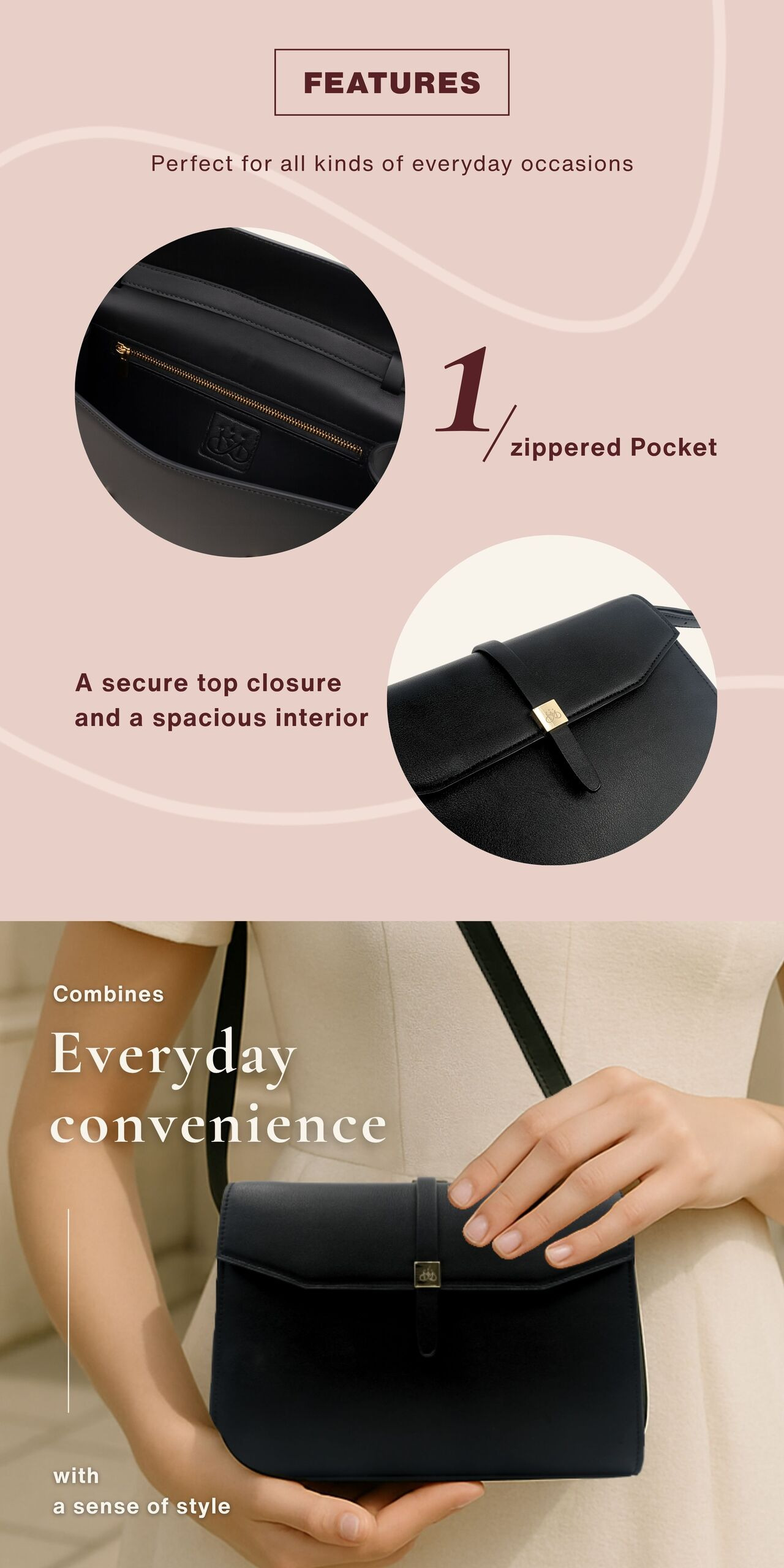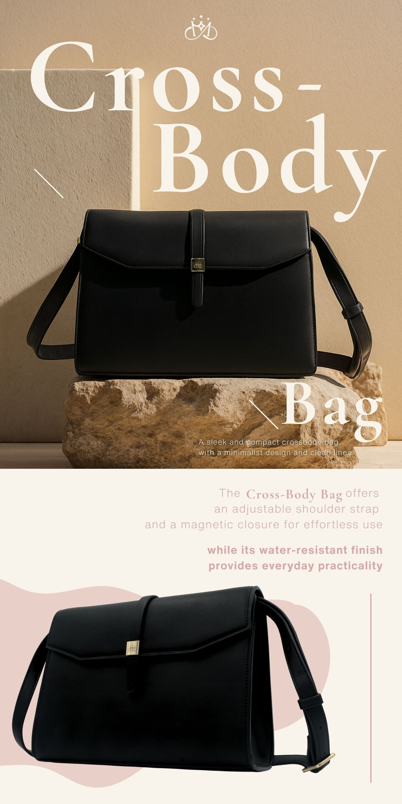 Made with eco-friendly waterproof vegan leather—elegant texture, lightweight & durable. Waterproof design means no rain worries, crossbody style frees your hands. Versatile black perfect for office, business trips, or dates.